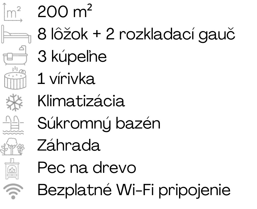 Vila sa rozprestiera na prízemí a ponúka veľké súkromné priestory. Hostia majú k dispozícii štyri elegantne zariadené izby a pohodlný rozkladací gauč (160 x 190 cm) umiestnený na poschodí. K dispozícii sú tri kompletne vybavené kúpeľne a veľká kuchyňa s jedálenským stolom a tradičnou pecou na drevo, zatiaľ čo obývacia časť je zariadená pohodlnými koženými pohovkami. Odtiaľ vedie točité schodisko do práčovne v suteréne. Vonkajšie priestory sú vždy udržiavané a ponúkajú nádherný výhľad na okolité vidiecke prostredie a vinice. Veľký stôl obklopený stoličkami robí z vonkajšej jedálne ešte príjemnejšie miesto, ideálne na stretnutia v letných večeroch. Záhrada sa rozprestiera na ploche viac ako 1800 m² a nachádzajú sa v nej rôzne ovocné stromy, olivovníky a aromatické rastliny, ako šalvia, rozmarín a mäta. Záhrada aj bazén (7 x 14 m) sú oplotené a určené výhradne pre hostí. K dispozícii sú tiež dva murované grily, stolný tenis a parkovisko. V roku 2025 bola pridaná nová vírivka (5 miest) s vyhrievanou vodou, ktorú je možné využívať po celý rok.Vila môže pohodlne ubytovať až 10 hostí, čo je ideálne pre rodiny alebo skupiny priateľov, ktorí chcú stráviť dovolenku v srdci Toskánska.Vila sa nachádza medzi Sienou a Florenciou, v pokojnej krajine na okraji mesta San Gimignano (SI). Cesta vedúca k vile je nezpevnená, ale dobre udržiavaná. Na dopravu k vile a pohyb po okolí je preto potrebné auto. Dve najbližšie turistické destinácie, obe vzdialené len ca 6 km, sú San Gimignano a Certaldo. Letisko vo Florencii je vzdialené 60 km, letisko v Pise 80 km.